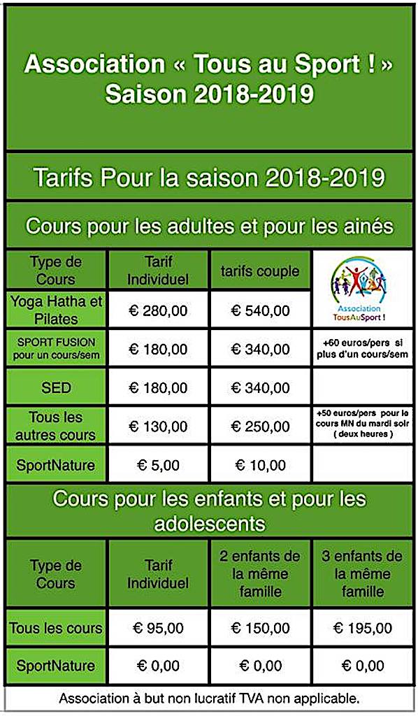 Tarifs des cours collectifs de l'association Tous au Sport pour 2018/19
