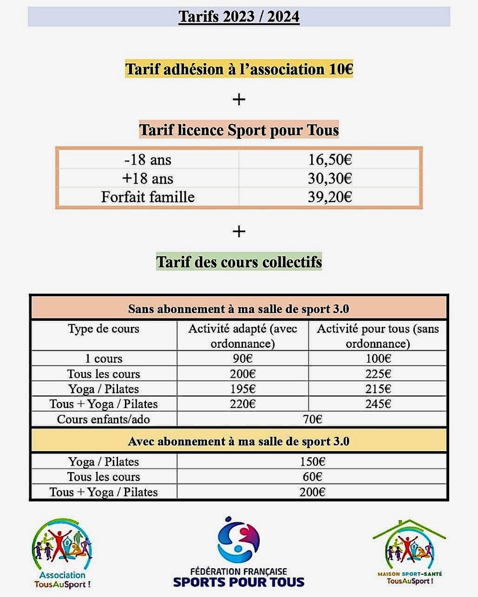 Vous êtes ici : Accueil Vie associative Les associations de Waldighoffen Espace Tous au Sport Waldighoffen Les images et documents de Tous au Sport Tarifs cours collectifs Association Tous au Sport