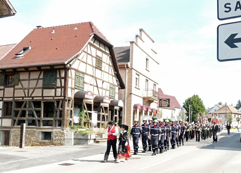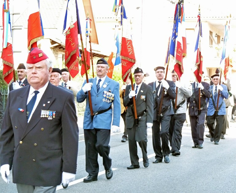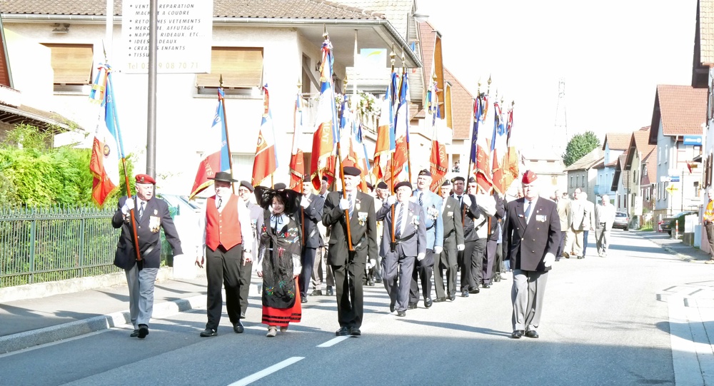 - Des participants à l'Assemblée Générale UNC du sous-groupe d'Altkirch le 11 septembre 2011 à Waldighoffen se rendant à la messe par le rue de la République.