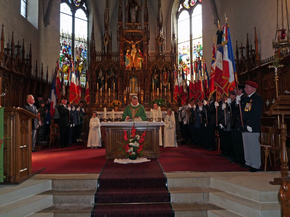 Photo du choeur où les portes-drapeaux des sections présentes se sont postés pendant la messe au cours de l'Assemblée Générale UNC du sous-groupe d'Altkirch du 11 septembre 2011 à Waldighoffen.