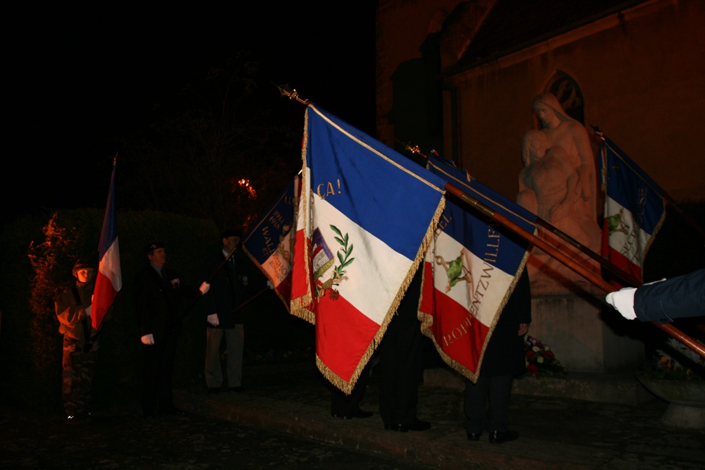 Les drapeaux baissés en hommage aux soldats tombés pendant le seconde guerre mondiale le 11 novembre 2011 à Waldighoffen.