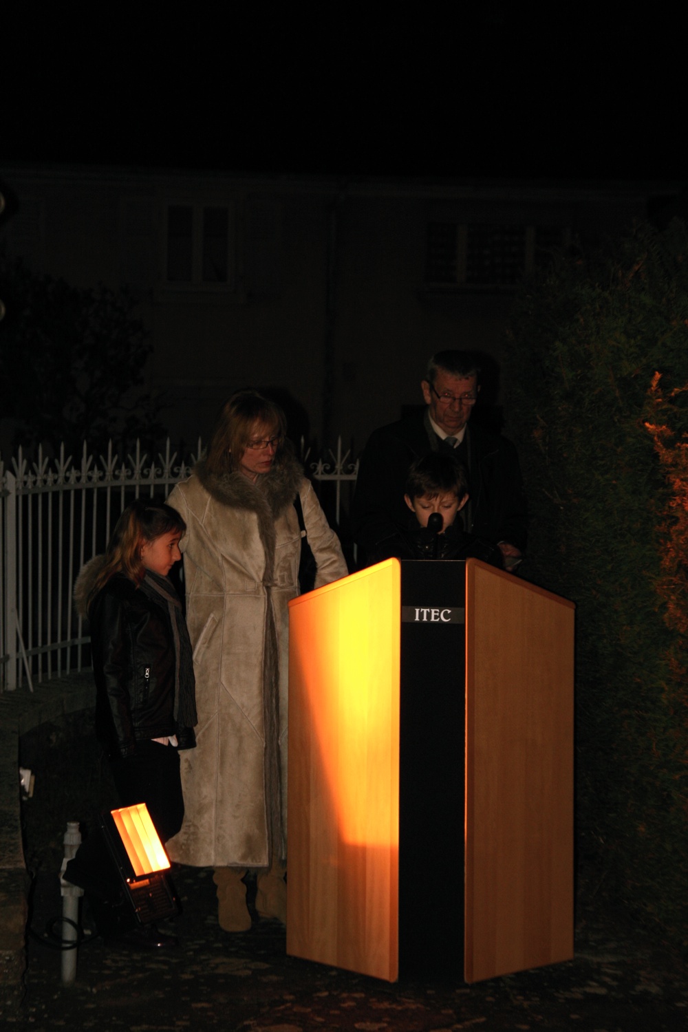 Photo d'Ethan Awcock pendant la lecture d'un texte sur la seconde guerre mondiale lors des commémorations du 11 novembre 2011.