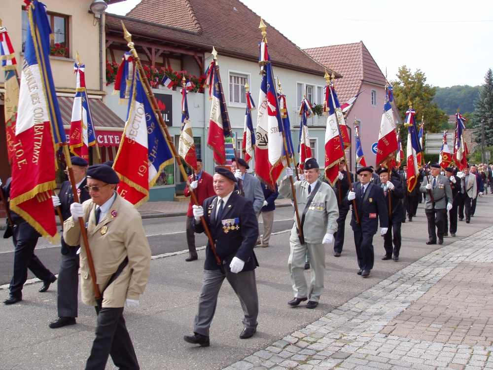Une partie du cortège des porte-drapeaux le 09 septembre 2007 à Waldighoffen pour le congrès départemental de l'UNC Haut-Rhin.