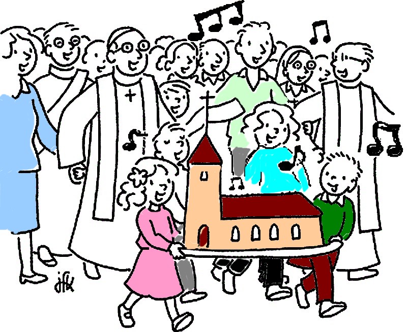 Dessin stylisé d'une reconnaissance de paroisse avec l'évêque, des prêtres et des fidèles adultes et enfants
