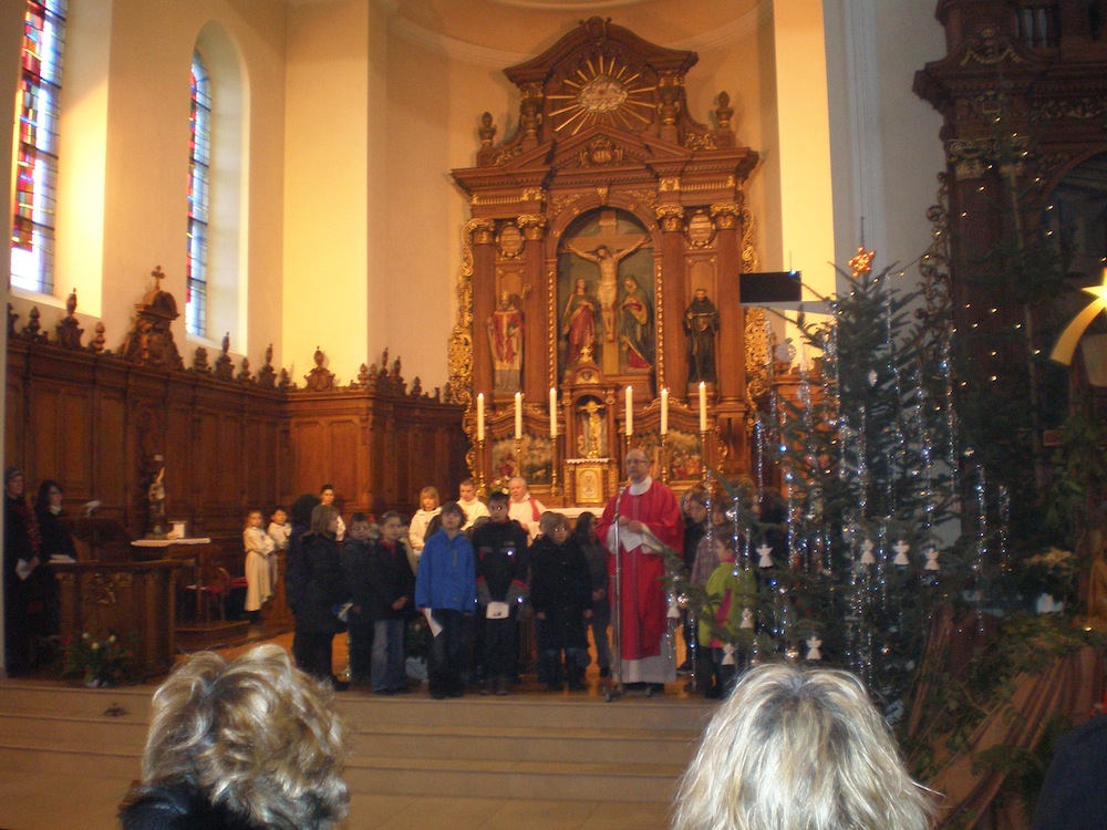 Un groupe d'enfant entoure le père Christophe lors de la messe pour le fête patronale interparoissiale le 22/01/2012.