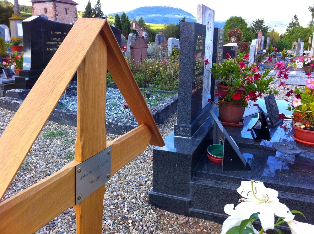 Vous êtes ici : Accueil Vie cultuelle Communauté de paroisses St Sébastien sur Ill et Gersbach Père François LICHTLE-obsèques La tombe du Père Lichtlé à Bergheim La tombe du Père François et, au fond, le Ht-Koenigsbourg