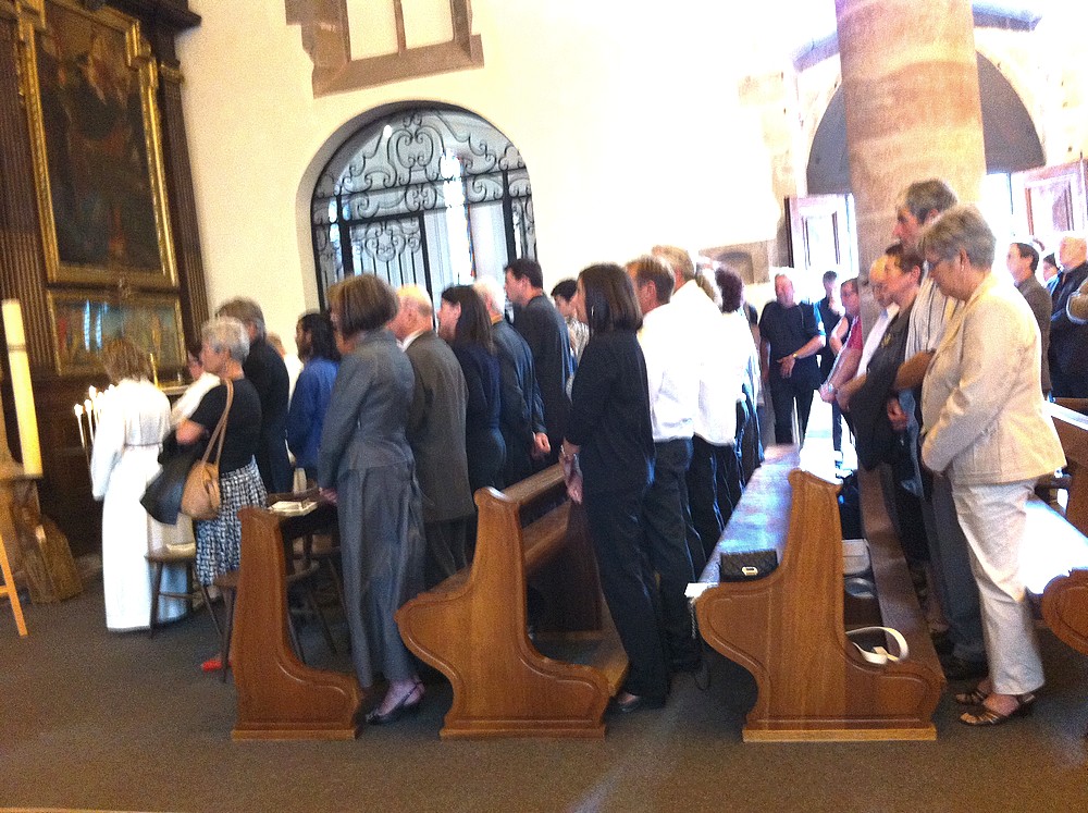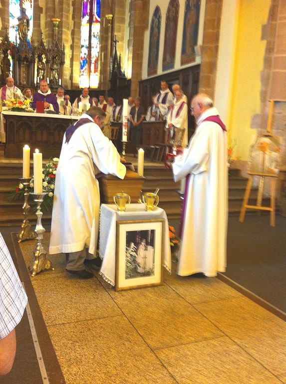 - Le cercueil du Père François Lichtlé entouré de 4 cierges et surmonté par les insignes de la prêtrise. Devant le cercueil, une photo de François Lichtlé célébrant la messe.