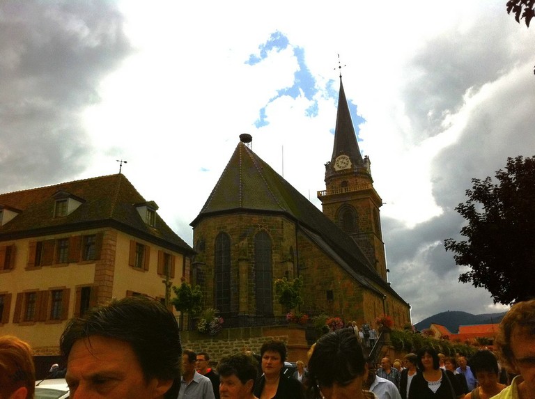 - Photo un peu floue, mais qui permet néanmoins de voir une église de Bergheim pleine de fidèles pour les obsèques du Père François Lichtlé