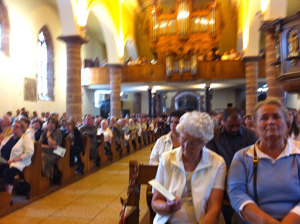 Photo un peu floue, mais qui permet néanmoins de voir une église de Bergheim pleine de fidèles pour les obsèques du Père François Lichtlé