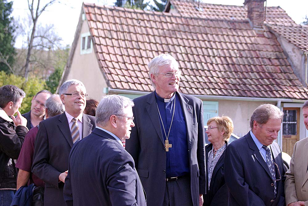 Mgr Grallet et des élus de Waldighoffen près du Foyer de Durmenach, en compagnie de l'abbé Hubert Schmitt