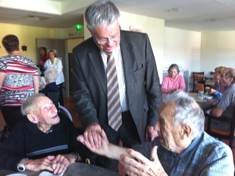 Le maire Henri Hoff salue l'ancien curé Ditner, nouveau résident depuis quelques jours en présence du résident centenaire.