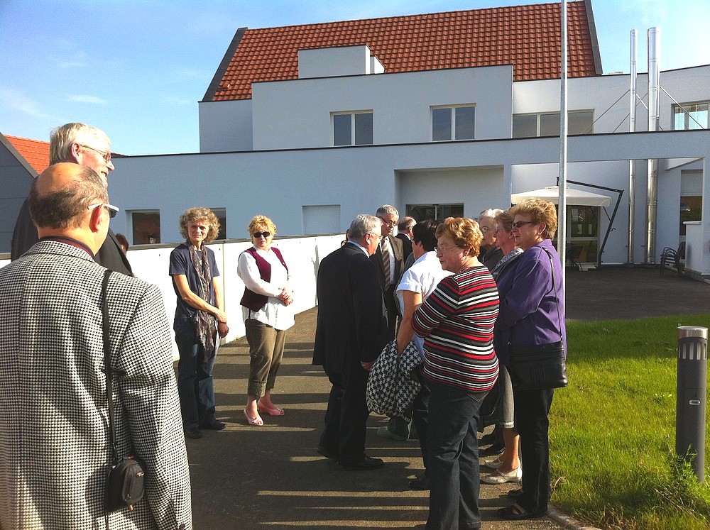 Les invités à la visite de l'EHPAD accueillent l'évêque Mgr Grallet au soleil.