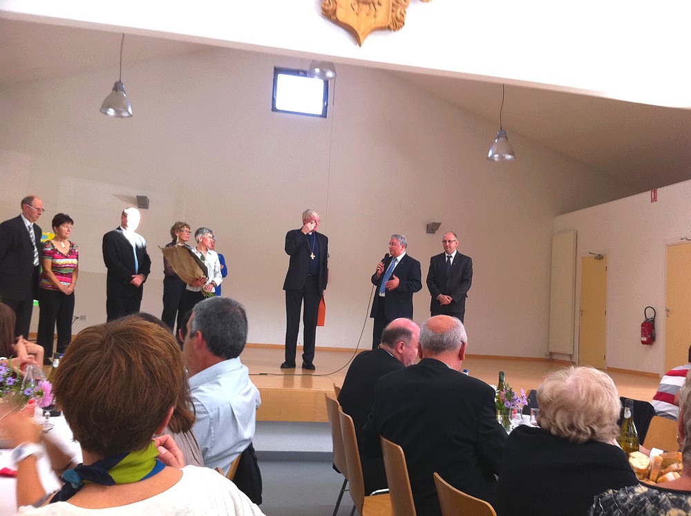Le Chanoine Hubert Schmitt s'adresse aux convives en présence de Mgr Grallet et des responsables.