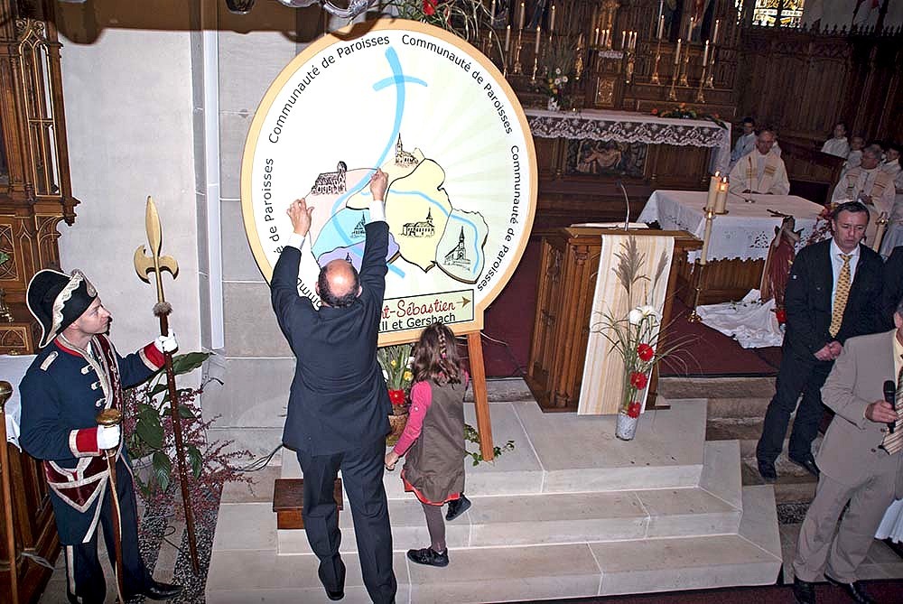 Le logo de la Communauté de Paroisses, dessiné par René Minéry, est complété au fur et à mesure de la cérémonie