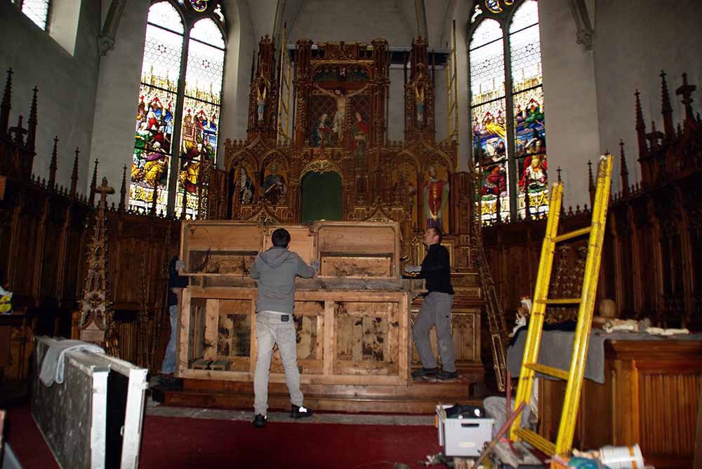 Le démontage du grand autel de l'église de Waldighoffen pendant les travaux de rénovation de l'église Saints Pierre et Paul.