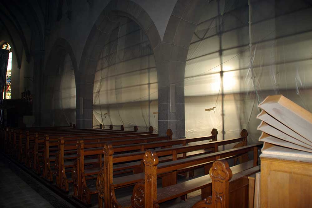 De grandes bâches ont été posées en travers de l'église pour les grands travaux de réfection engagés à l'église Saints Pierre et Paul de Waldighoffen.