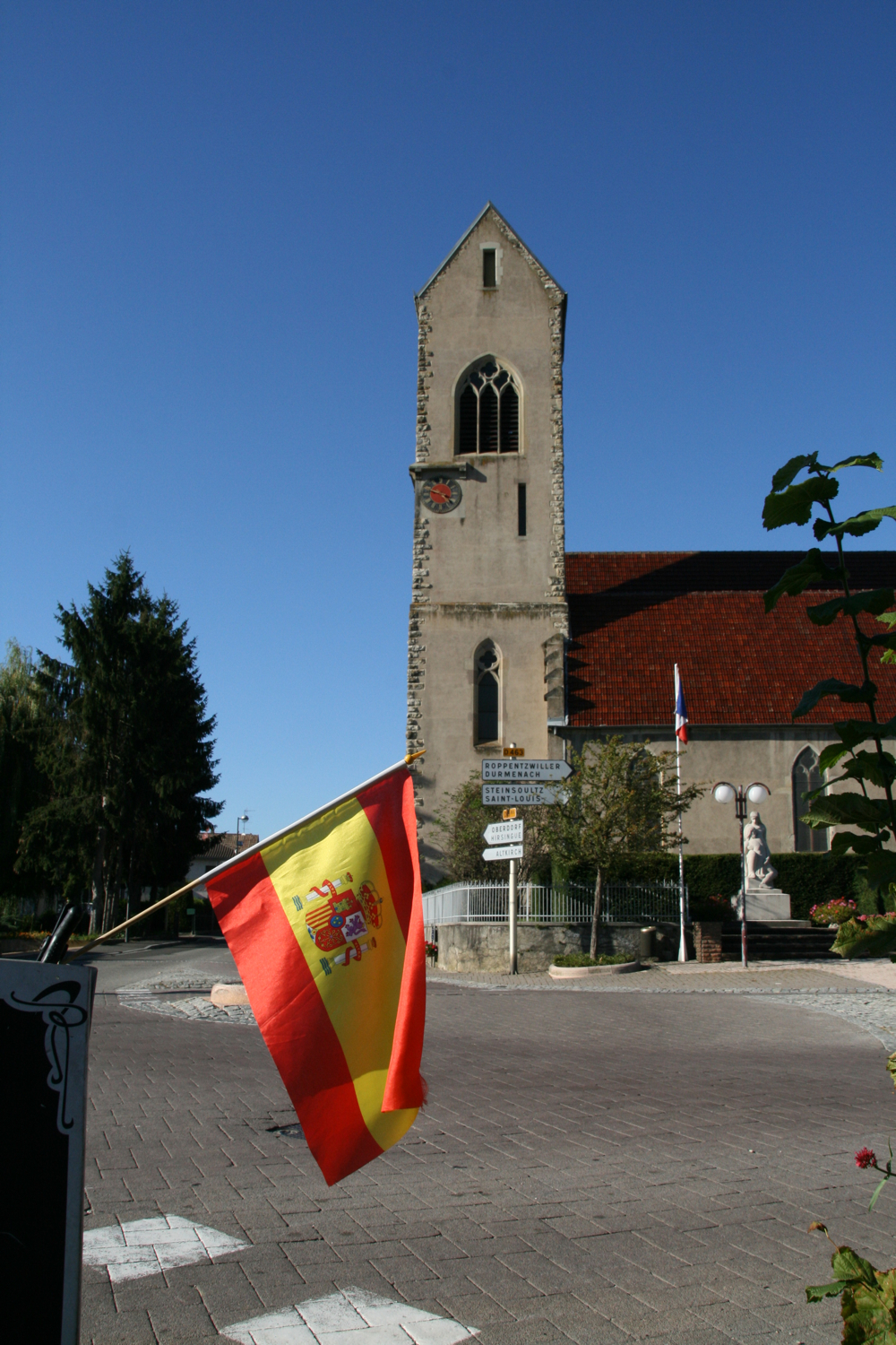 Photo verticale du drapeau espagnol en prolongement de la rue de la République, en arrière plan on peut voir l'église de Waldighoffen.