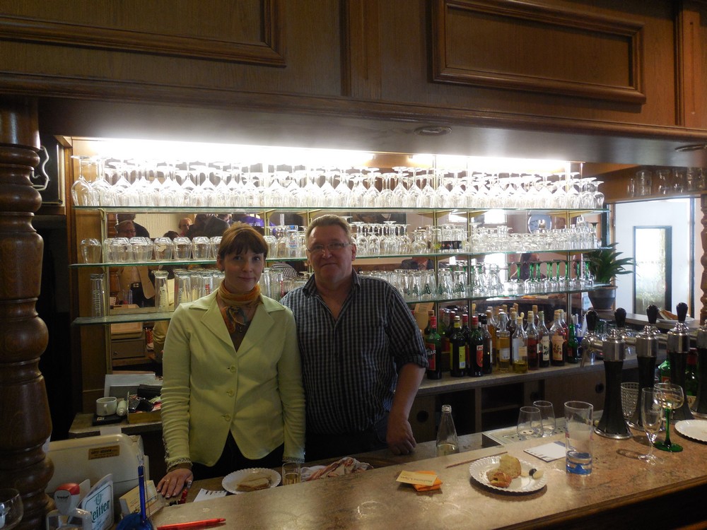 Le patron Bruno et sa compagne Nathalie posent derrière le bar pour leur dernière soirée d'ouverture.