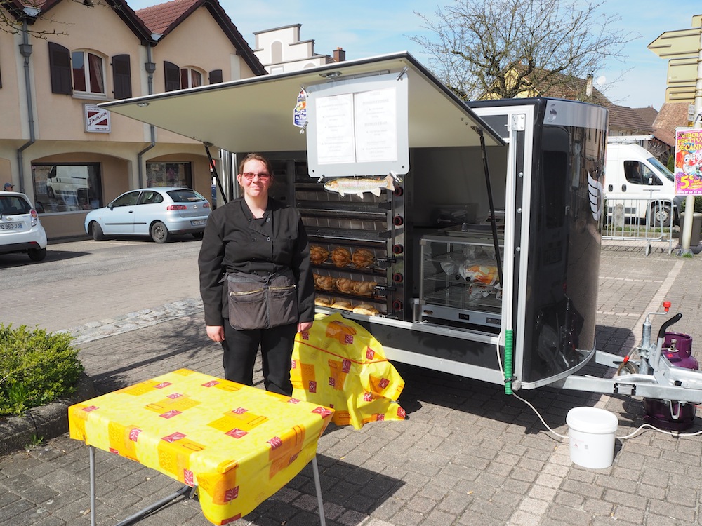 Stand de poulets rôtis et de poisson frais au marché de Waldighoffen.
