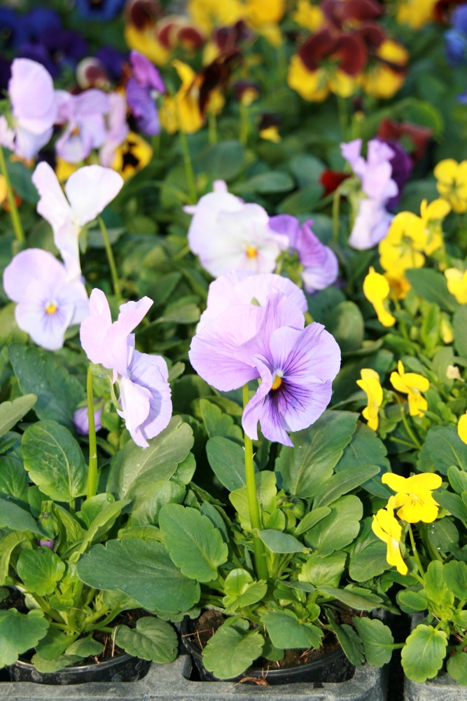 Gros plan de pensée mauves du stand Sundgau Fleurs au marché hebdomadaire de Waldighoffen.