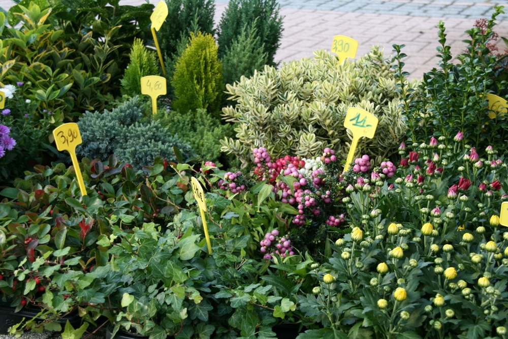 Photo de diverses plantes et arbustes du stand Sundgau Fleur au marché hebdomadaire de Waldighoffen.