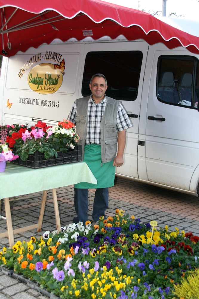 Jean-Luc Ruetsch devant son stand Sundgau Fleurs pendant le marché hebdomadaire de Waldighoffen.