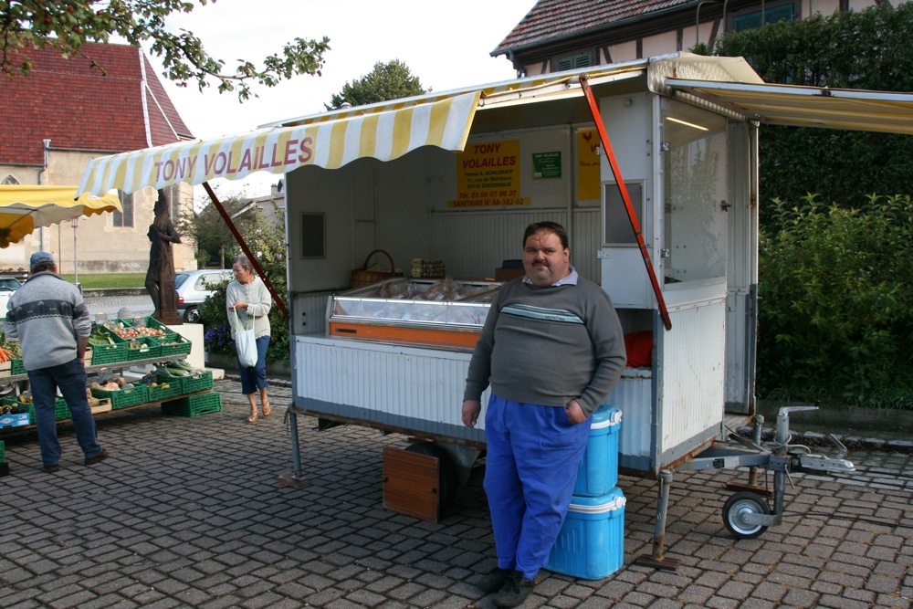 Daniel Schluraff devant son stand Tony Volailles au marché hebdomadaire de Waldighoffen.