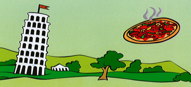 La tour de Pise et une pizza dessinées sur fond vert.