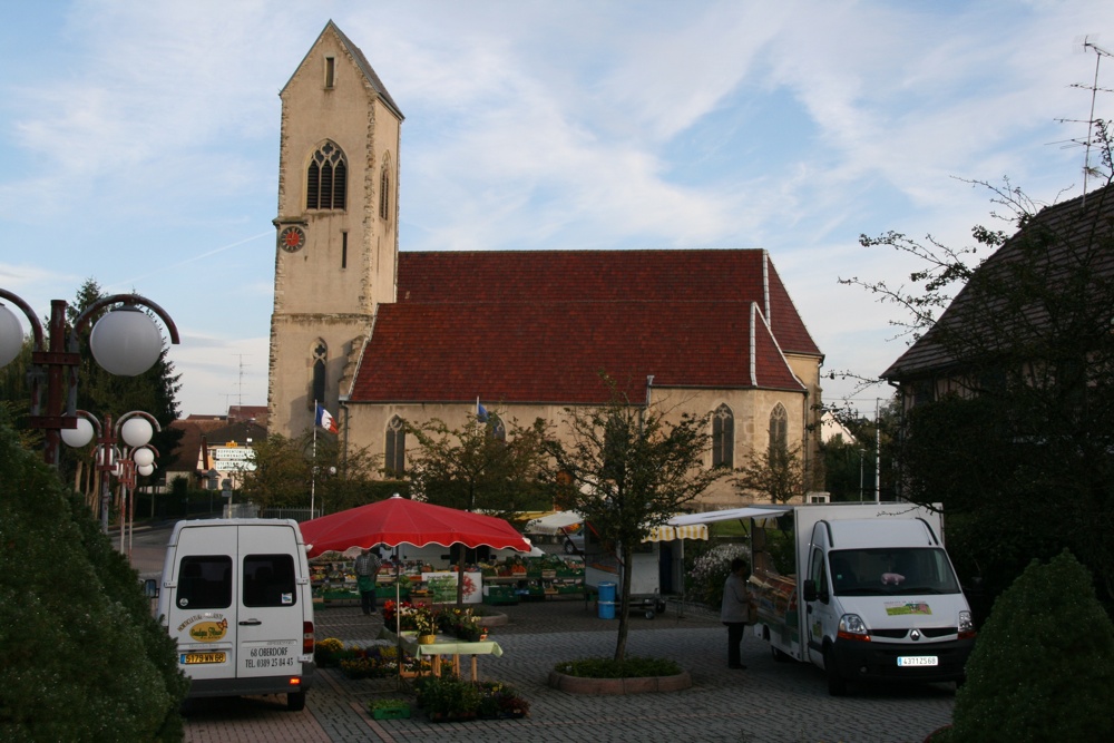 Vue depuis la Mairie de Waldighoffen du marché hebdomadaire sur la place Jeanne d'Arc.