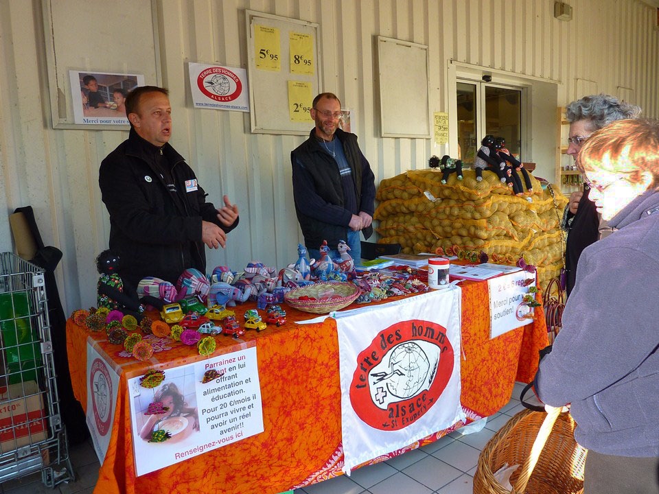 Le stand de Terre des Hommes devant un magasin de Waldighoffen pendant le semaine de la générosité.