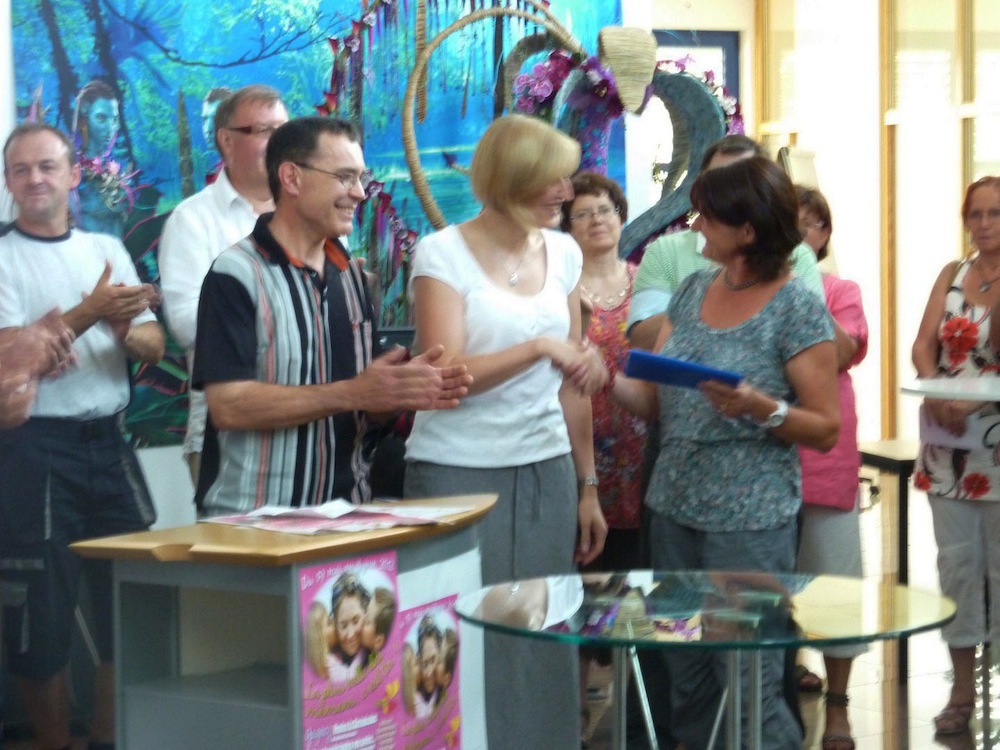 La gagnante du gros lot Madame Stehlin Colette reçoit son gain, un voyage à Venise pour 2 personnes.