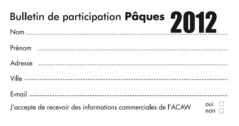 Le coupon de tombola de la quinzaine commerciale de l'ACAW du 21 mars au 7 avril 2012.