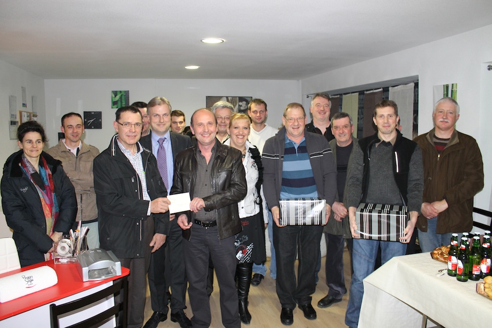 Photo de groupe des commerçants participants à l'opération commerciale de Pâques 2012 à Waldighoffen, pour la remise des lots pendant l'inauguration de Minciform.