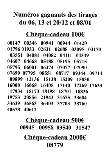 Vous êtes ici : Accueil Vie économique ACAW - Association des commerçants et artisans de Waldighoffen Images Acaw Numéro gagnants - opération de noël 2017