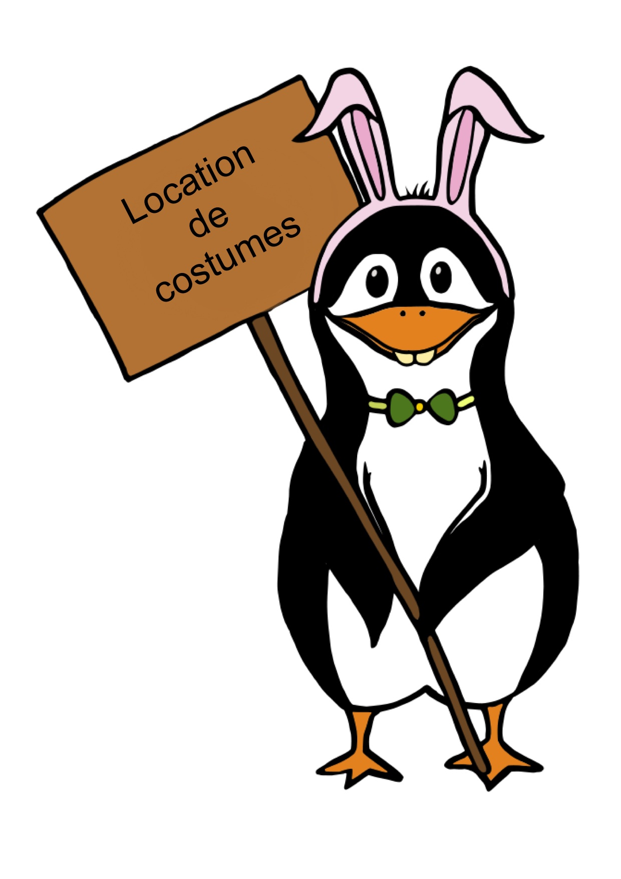 Dessin déguisé en lapin portant un panneau "Location de costumes".