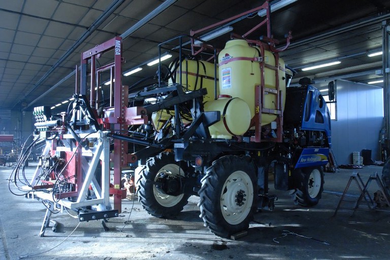 - Une vue arrière de l'adaptation d'un épandeur très large sur une machine à vendanger par A.C.S Andelfinger à Waldighoffen.