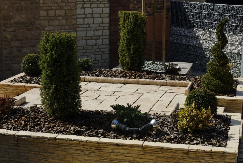 Un exemple de terrasse avec un muret en pierre sèche et des arbustres chez BigMat Kammerer à Waldighoffen.