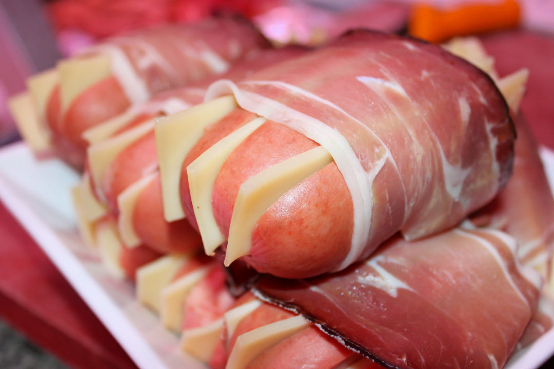 Des cervelas farcis au comté et enroulés dans du jambon cru, proposé par la Boucherie Charcuterie Weigel à Waldighoffen.