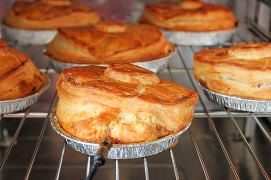 Les tourtes trois suprêmes de la Boucherie Charcuterie Weigel au four, composées de viande de dinde, de poulet et de canard.