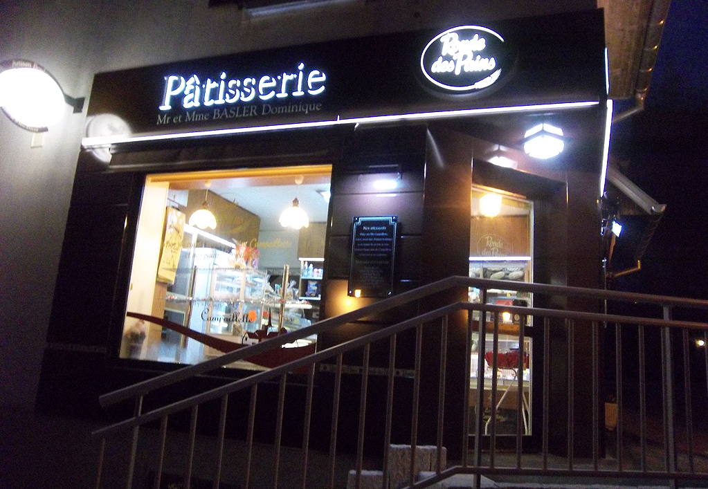 L'extérieur de la Boulangerie Pâtisserie Basler de nuit