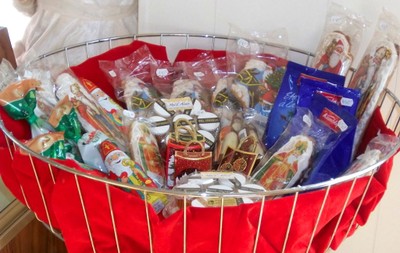 Un panier rempli de chocolats, biscuits ou pains d'épices pour Noël à la Boulangerie Pâtisserie Basler à Waldighoffen.