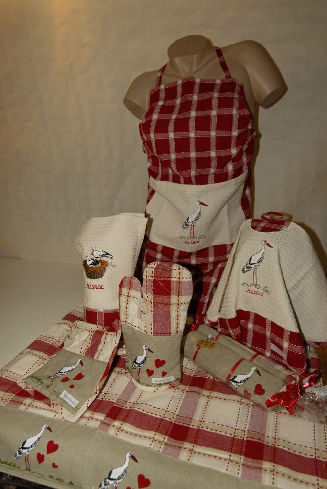 Gants de cuisine, tablier, nappe de table, serviettes, etc. aux couleurs de l'Alsace, rouge et blanc avec une cigogne alsacienne chez Dietschy à Waldighoffen.