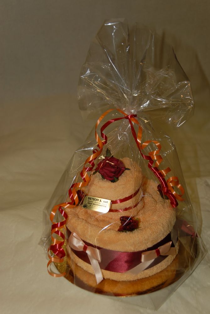 Ces serviettes de bain couleur saumon de chez Dietschy à Waldighoffen, sont enroulées en forme de gâteau et déjà emballées pour être offertes.