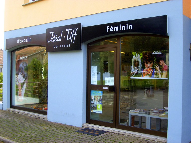 - La façade du salon de coiffure Idéal'Tiff à Waldighoffen avec une vitrine masculin et une vitrine féminin.