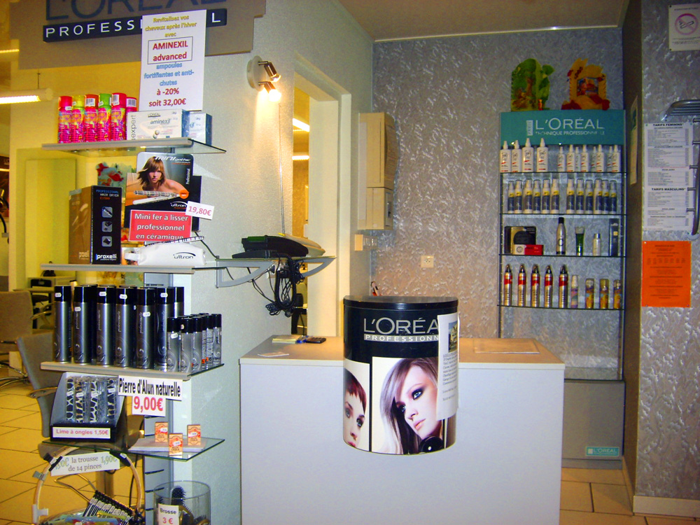 Vue sur l'accueil du salon de coiffure Idéal'Tiff à Waldighoffen entouré par des produits et des publicités de la marque L'Oréal professionnel.