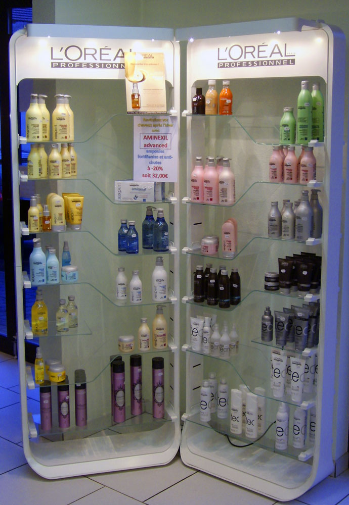 Un espace vente de la marque l'Oréal professionnel au salon de coiffure Idéal'Tiff à Waldighoffen.