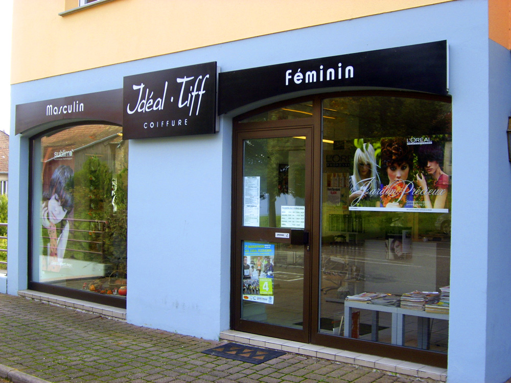 La façade du salon de coiffure Idéal'Tiff à Waldighoffen avec une vitrine masculin et une vitrine féminin.