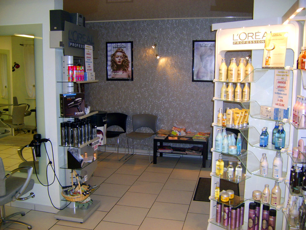 Vue sur la salle d'attente du salon de coiffure Idéal'Tiff à Waldighoffen et sur une étagère avec des soins de cheveux de la marque l'Oréal.