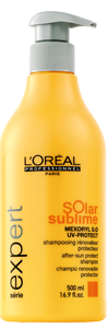 shampooing Solar Sublime 500ml: rénovateur et protecteur; élimine tous les résidus (sel, chlore, sable). Facilite le démêlage!