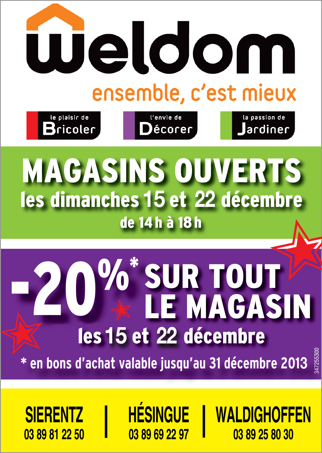 Affiche pour les 20% de remise sur tout le magasin Weldom jusqu'au 31 décembre 2013.